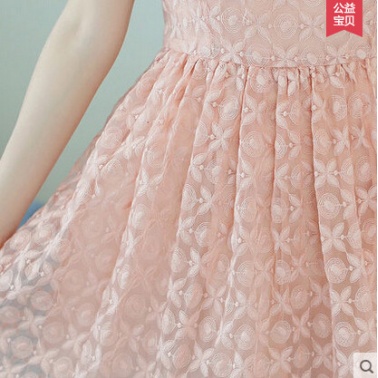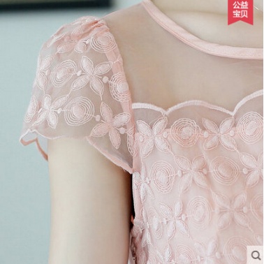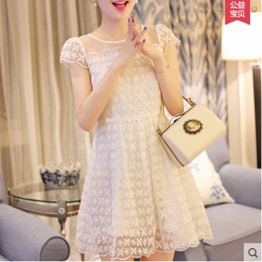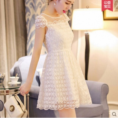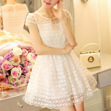 荷叶边欧根纱刺绣短袖镂空蕾丝连衣裙 夏韩系小香风短裙A字连衣...